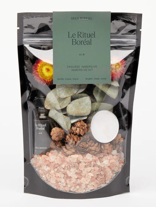 Contains: Himalayan pink salt, straw flowers, eucalyptus, pine cone, floating candle, pack of 36 incense matches, Boreal Ritual botanical oil (Balsam fir essential oil, sweet almond oil, argan oil, avocado oil, apricot oil, natural fragrance and vitamin).