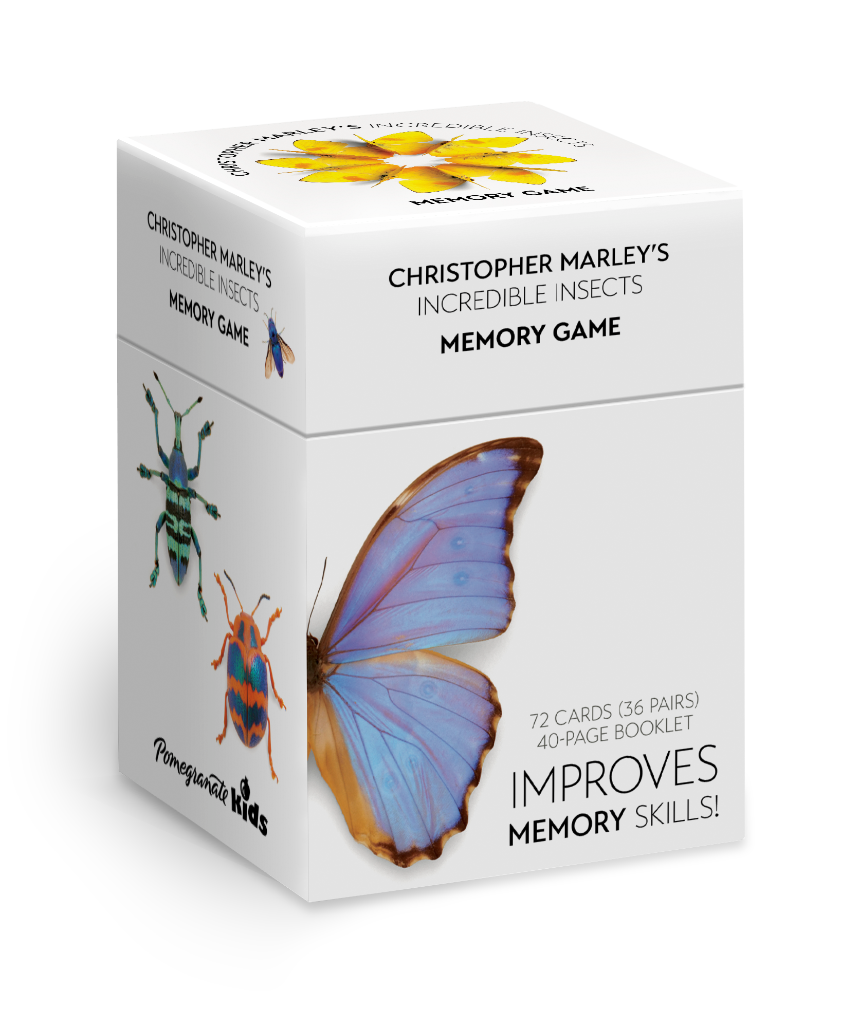Sharpen your recall with this game for two or more players of any age. Using 36 of designer Christopher Marley’s incredible insects, this memory game includes images of beautiful beetles, butterflies, moths, damselfies, weevils, and more. Match pairs to win while enjoying the astonishing diversity of beautiful bugs from around the world. Instructions for play are printed on the bottom of the sturdy, reusable box, which neatly stores cards between games and includes a 40-page information booklet with details about the featured artwork. 72 colorful square cards (36 pairs) • Unique small package is easily stored at home and for travel • A perfect game for children and adults to test and improve memory function