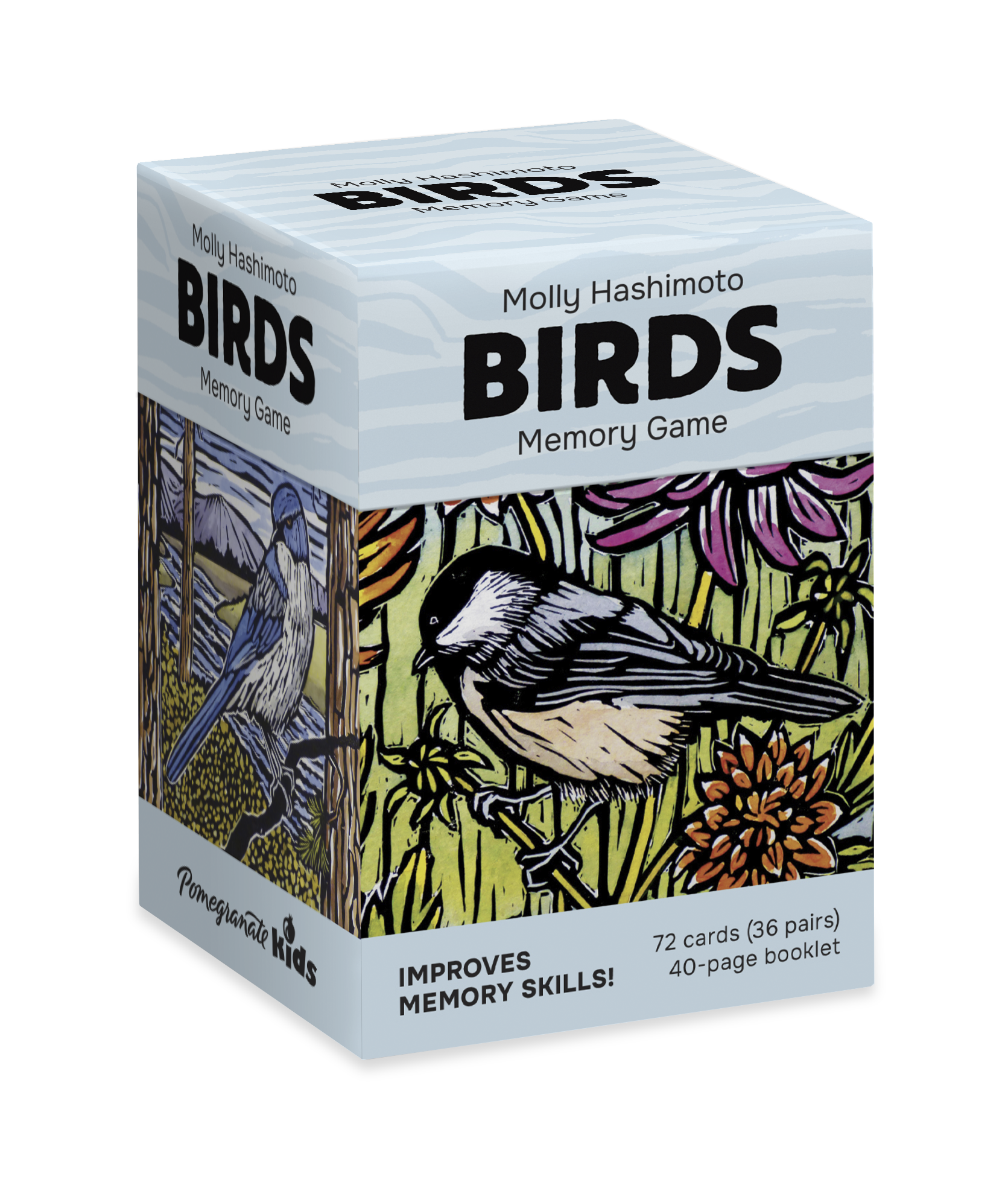 From bluebirds to bald eagles, this memory game includes 36 avian pairs illustrated by artist Molly Hashimoto. The 40-page booklet includes information about her artwork—each relief print its own peaceful window into the world of birds—as well as a fun fact about the bird shown. • Unique small package is easily stored at home and for travel • A perfect game for children and adults to test and improve memory function • Sturdy cards will hold up for countless hours of play • High-quality printing and packaging